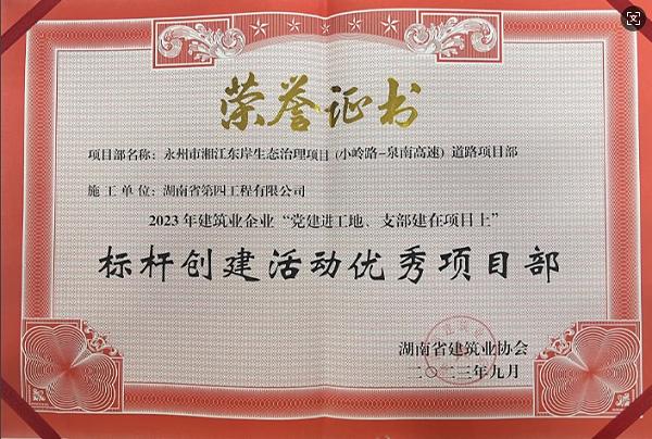 分公司將“雙管行動(dòng)”示范項(xiàng)目——永州市湘江流域生態(tài)綜合治理項(xiàng)目樹為標(biāo)桿,成立項(xiàng)目黨支部,項(xiàng)目經(jīng)理擔(dān)任支部書記,黨員干部帶頭開展好廉潔文化進(jìn)工地、安全應(yīng)急演練等多項(xiàng)活動(dòng),并獲2023年建筑業(yè)企業(yè)“黨建進(jìn)工地、支部建在項(xiàng)目上”標(biāo)桿創(chuàng)建活動(dòng)優(yōu)秀項(xiàng)目部榮譽(yù)稱號。在項(xiàng)目建設(shè)中,黨員干部帶頭攻堅(jiān)克難,提前約360天工期完成要求節(jié)點(diǎn)的通車目標(biāo),被市級領(lǐng)導(dǎo)給予了高度評價(jià)和稱贊。